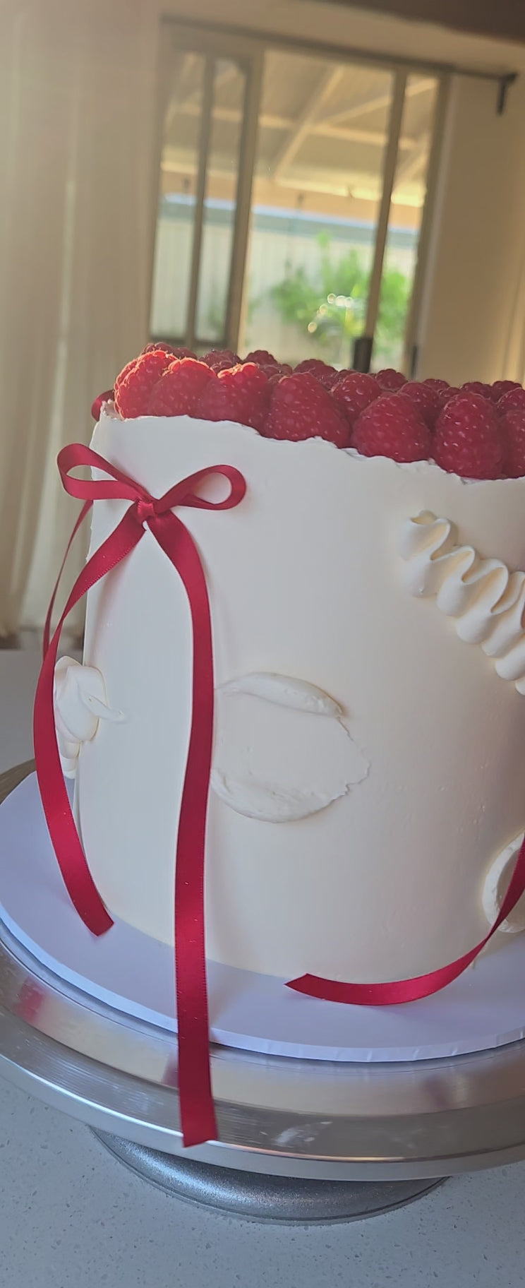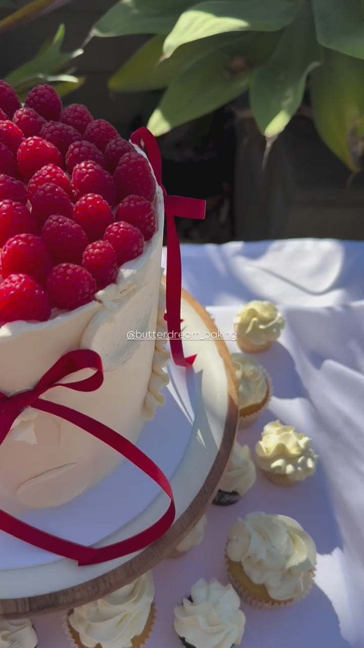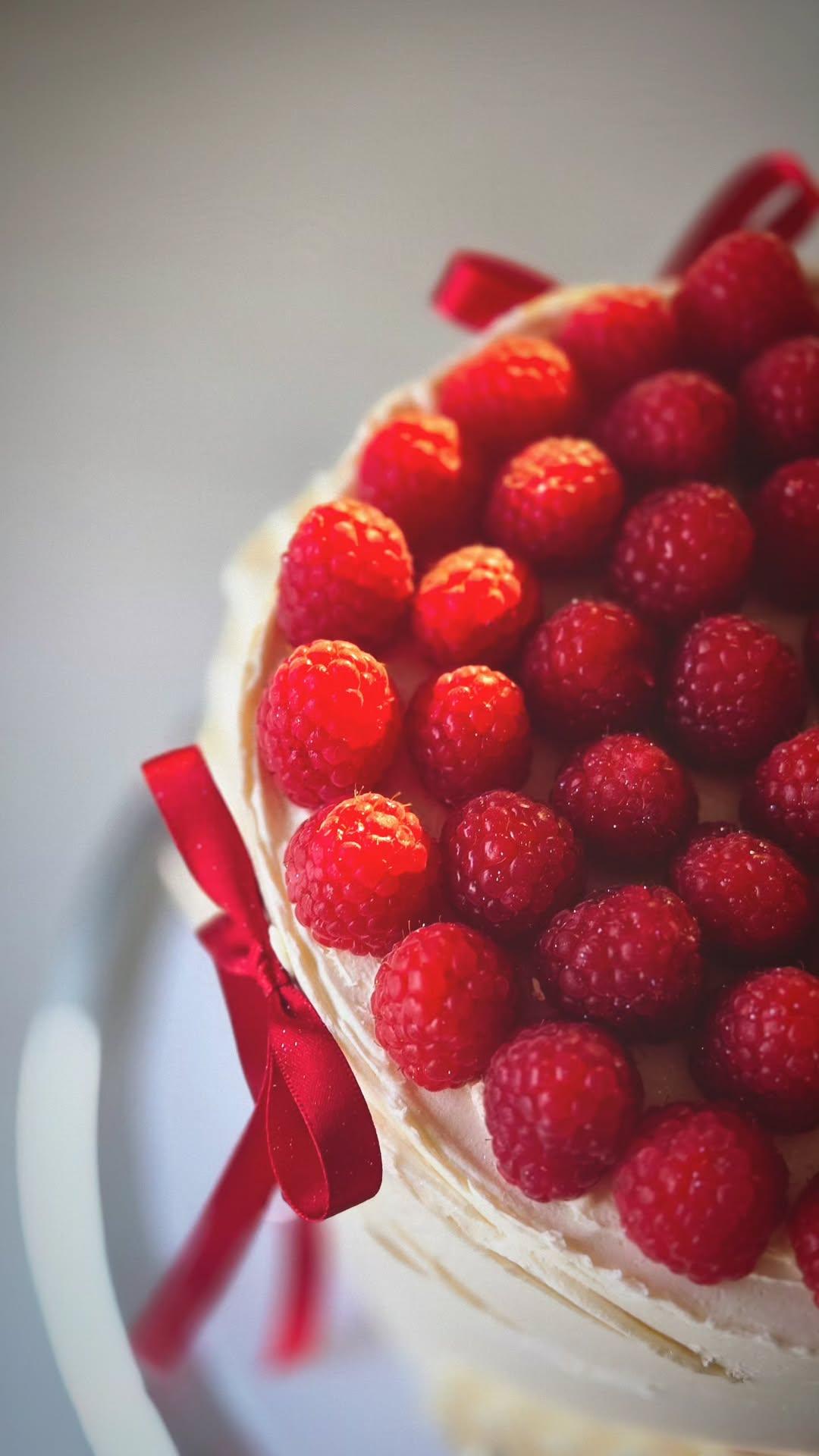 Both come decorated as pictures, with Christmas red ribbons and topped with beautiful fresh raspberries.